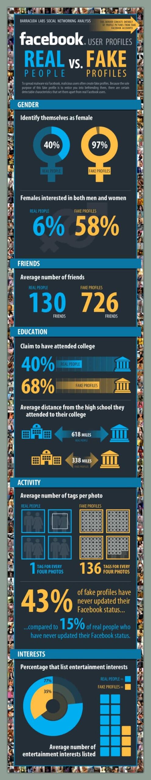 Sin embargo, si aún así quieren arriesgarse, les cuento que es muy probable que un perfil falso sea el de una chica, que además diga que le gustan chicos y chicas, que además no ha actualizado casi nunca su perfil, y que está etiquetada en todas las fotos o en la mayor parte de las que sale. Si todo esto se cumple, entonces muy probablemente se encuentren ante un fake, vamos un perfil falso de Facebook en toda regla. De todas maneras, la infografía completa, la pueden ver justo a continuación.