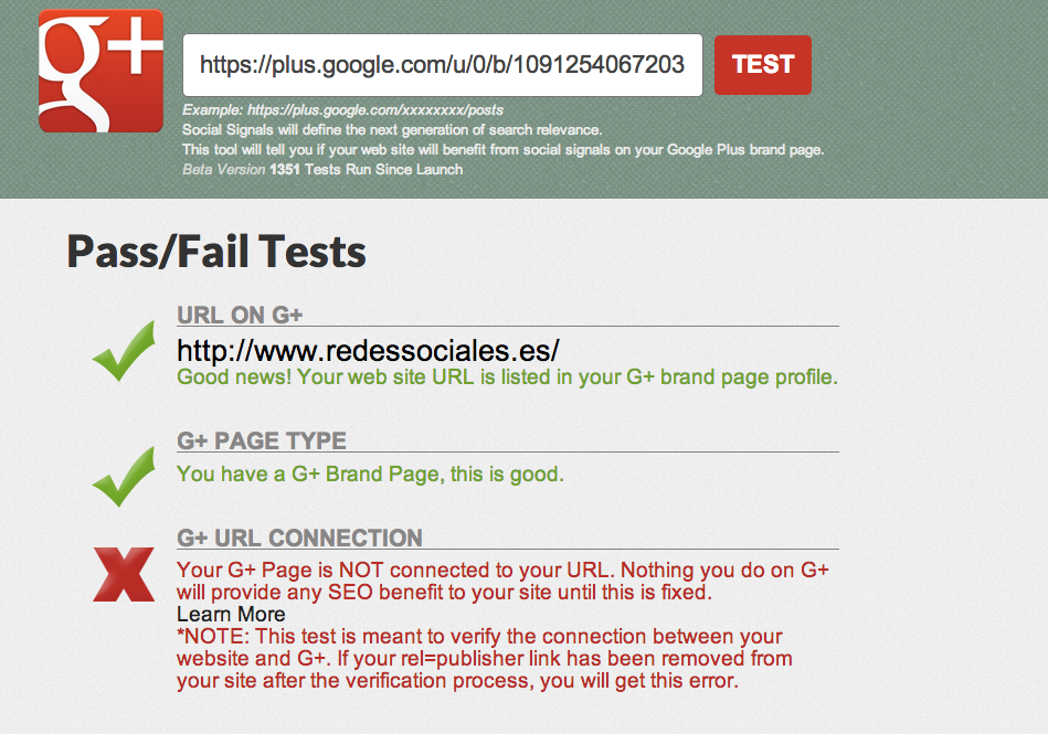 Si quieres saber si tu página de empresa en Google Plus es correcta de forma sencilla, tan solo tienes que acceder con el nombre de ésta, el cual encontrarás en la url que te aparece cuando accedes a ella, y hacer este test online gratis en el que se te indicarán todos los requisitos para una página en Google Plus válida y aparecerán en color rojo los que te faltan por cumplir, con consejos sobre cómo hacerlo, y en color verde los que ya has pasado de forma correcta.