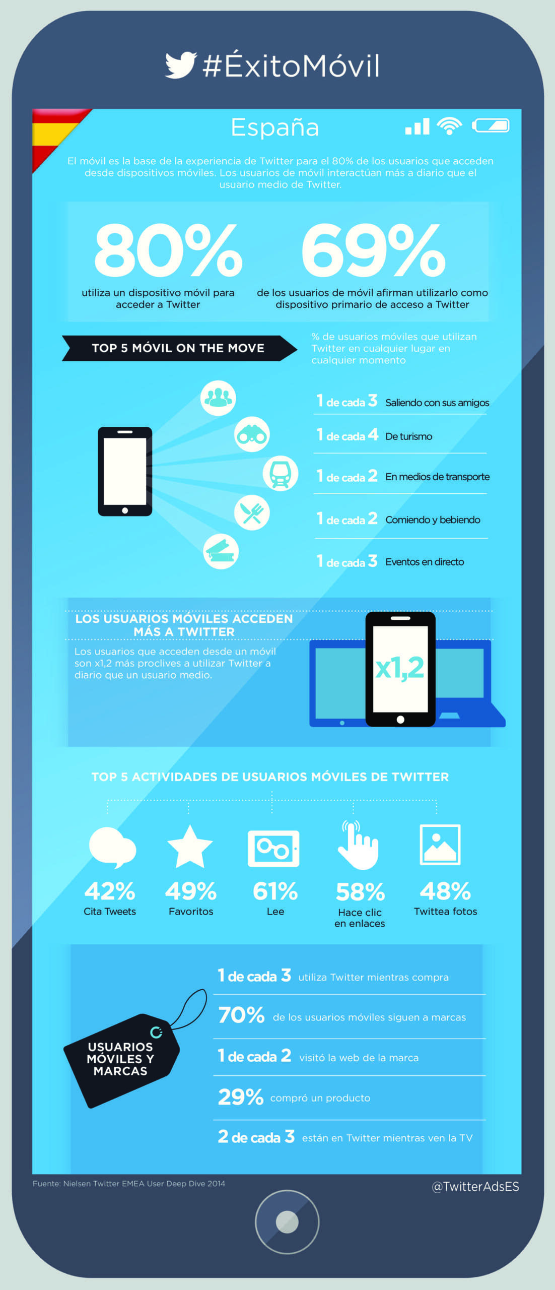 La red social Twitter con sus 140 caracteres, rapidez de envío y pensada para ser usada desde el móvil es sin duda una herramienta intensamente utilizada por el usuario móvil y por ello es clave a la hora de buscar un impacto publicitaria sobre él, más aún si hablamos del mercado español donde podemos encontrar datos de uso ofrecidos por Nielsen tan relevantes como los siguientes: