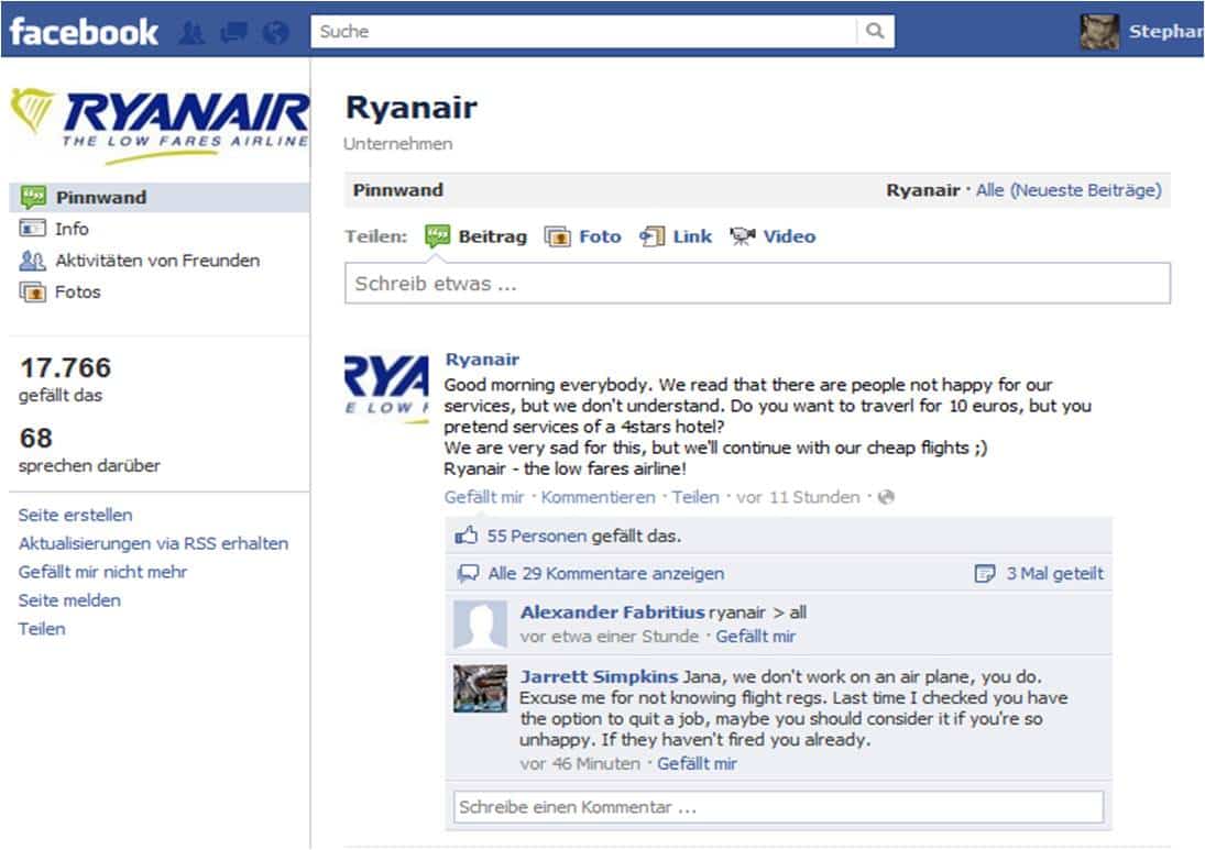 A los fallos de comunicación genéricos que les acabo de mencionar y que podemos ver nada más echar un vistazo al Facebook de Ryanair, lo cierto es que vemos también como el cliente apenas tiene un papel que jugar en la página. Las promociones brillan por su ausencia, la marca está ausente y las quejas y malos comentarios ruedan como la bola de nieve en el propio terreno de la compañía. Así, desde luego, no se hacen las cosas.