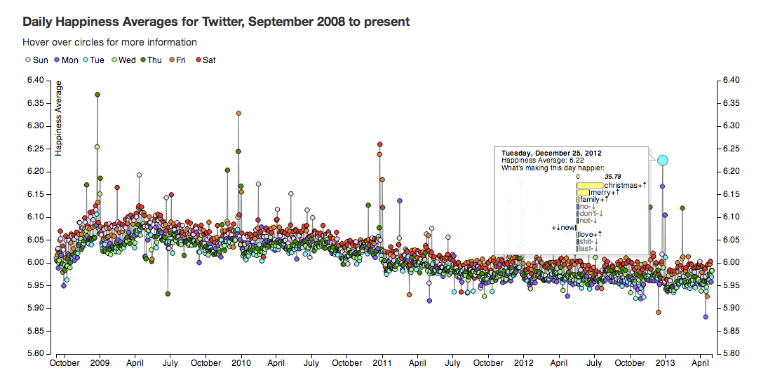 Lo cierto es que puedes echar un vistazo en un momento determinado lo felices o lo tristes que somos en Twitter. Y la verdad es que si echamos un vistazo en el tiempo atrás, desde que se pueden tomar datos de Twitter, la verdad es que hemos empeorado un poco en la felicidad, y ahora mismo lo somos menos que antes. Quitando puntos arriba y puntos abajo que además vienen dados por acontecimientos, y creo que es una forma interesante de conocer nuestra realidad.
