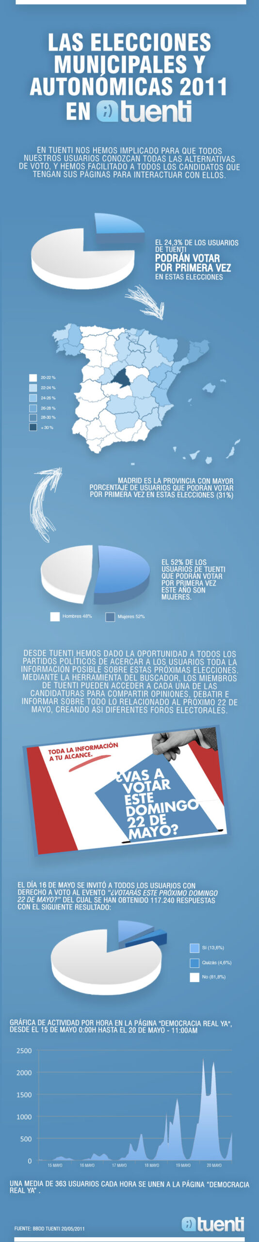 Hoy, jornada del día después de las elecciones desde Redes Sociales, os traemos una infografía en la que se recogen las principales opiniones de los que son usuarios de la red social Tuenti. Es más una expresión de los internautas, de una edad muy joven, ya que en Tuenti la media de edad esde veinte años, y con la que se pueden sacar reflexiones acerca de la percepción política y democrática de nuestro país.