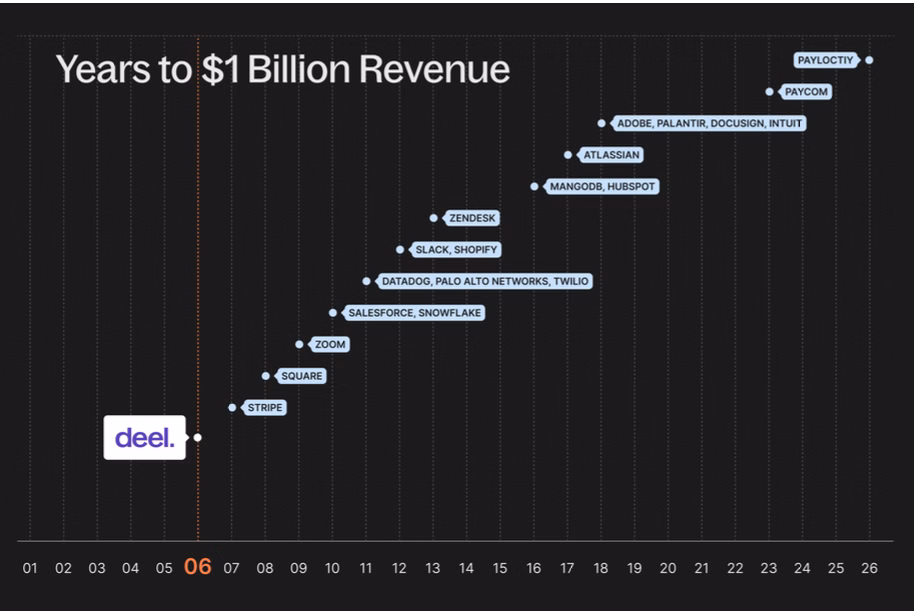 Hay hilos de X que se leen y se archivan; y hay otros que invitan a reescribir un playbook. El de Alex Bouaziz, cofundador y CEO de Deel, es de los segundos. Con el anuncio de una Series E de 300 M$ a una valoración de 17,3 B$, Bouaziz repasó cómo la compañía ha pasado, en apenas seis años, de no conseguir ni 10.000 $ a superar 1.200 M$ de ARR, firmar su primer mes de 100 M$ de ingresos (septiembre) y, sobre todo, alcanzar 1.000 M$ ARR más rápido que referentes como Stripe, Palantir, Square o Salesforce. La gráfica que acompaña el hilo lo deja claro: el hito llega alrededor del año 6, por delante de casi todos los grandes del software empresarial.