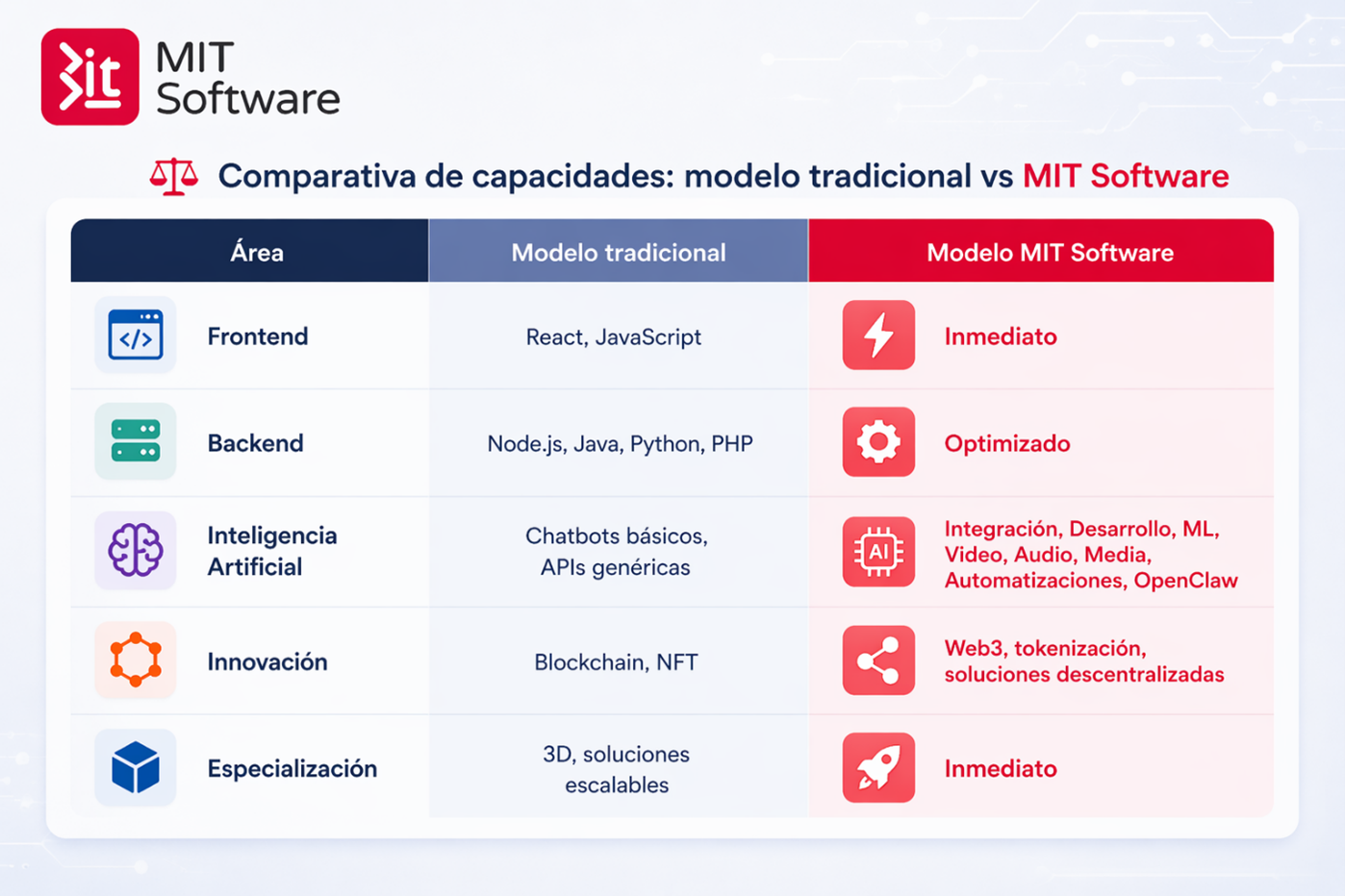 En respuesta a esta realidad, MiT Software ha desarrollado el modelo de «talento tech bajo demanda», diseñado para ofrecer una solución flexible que expande las capacidades tecnológicas de las empresas. Este enfoque no busca reemplazar a los equipos existentes, sino potenciarlos al integrar talento especializado que acelera ejecución, mejora la calidad del desarrollo y optimiza los resultados.