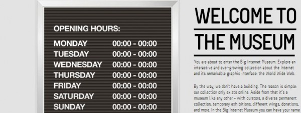Hoy volvemos a hablarles en nuestro blog de contenidos digitales, pero vamos a hacerlo de la mano de un recurso que a mi me ha parecido de lo más útil. Se trata de la web The Big Internet Museum, que como podrán haber supuesto por el nombre, y de paso por la captura de pantalla con la que hemos abierto este post, estará abiertas las 24 horas del día, los 365 días del año; algo a lo que ya estamos acostumbrados en el mundo online, pero que puede convertirse en una herramienta indispensable para encontrar lo que buscamos.